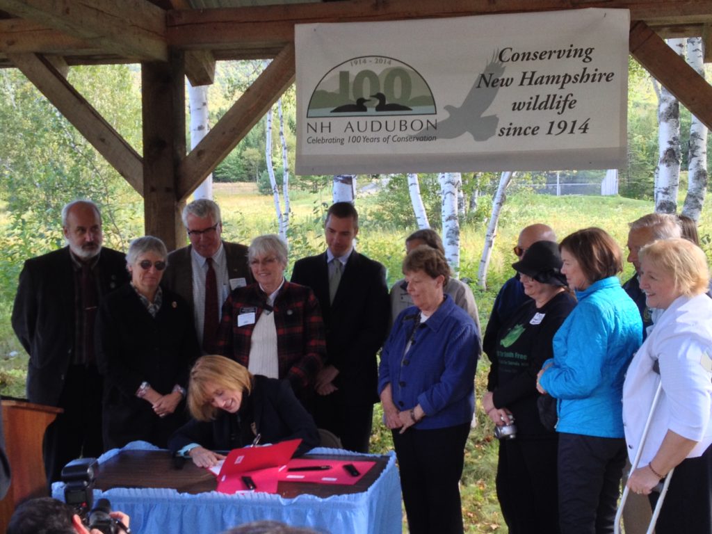 Gov. Maggie Hassan signs SB 325, HB 1224, and HB 1376 surrounded by legislators and volunteers who supported the bills. From left to right, directly behind the Governor, are Carol Foss, NH Audubon Conservation Director; Senator Jeff Woodburn (D-Dalton), SB 325’s prime sponsor, Rep. Marcia Hammon (D-Whitefield), HB 1376’s prime sponsor; and Sheridan Brown, NH Audubon Legislative Coordinator. DEBRA BROWN PHOTO.