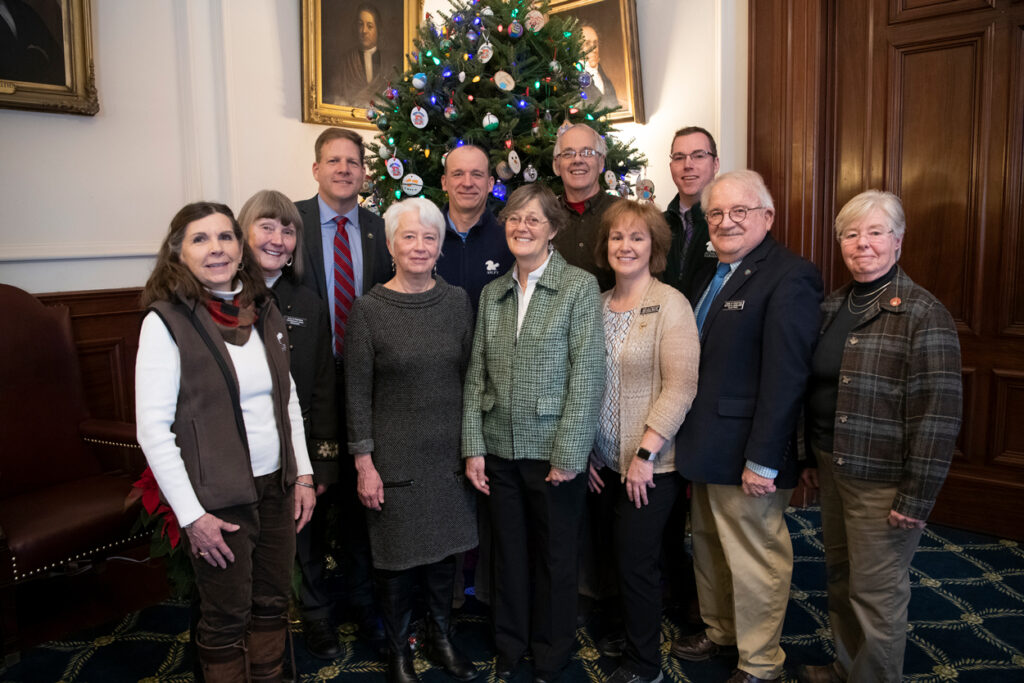 Ausbon Sargent and Town of Grantham representatives at the Land and Community Heritage Investment Program (LCHIP) Awards Ceremony, where Grantham received a $215,000 grant for the purchase of the Sawyer Brook Headwaters Property. L to R: Deborah Stanley, Executive Director, Ausbon Sargent Land Preservation Trust; Connie Jones, Grantham Board of Selectmen; Governor Chris Sununu; Amanda Merrill, LCHIP Board Chair; Andrew Deegan, ASLPT; Dijit Taylor, LCHIP Executive Director; Warren Kimball, Grantham Board of Selectmen; Melissa White, Grantham Town Administrator; Attorney Sheridan Brown, Grantham; Peter Garland, Grantham Board of Selectmen.